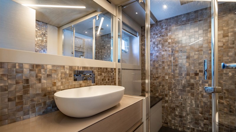 This luxury motor yacht has accommodation for six guests in three cabins. All located on the lower deck, the arrangement comprises a full-beam master suite, VIP double, and a guest twin - all of which are en suite.